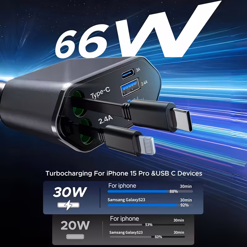 4-in-1 Retractable 66W Fast Car Charger | PD + QC3.0 Compatible | For iPhone & Android | Fiza.pk