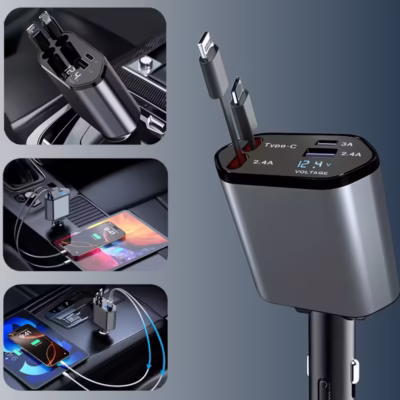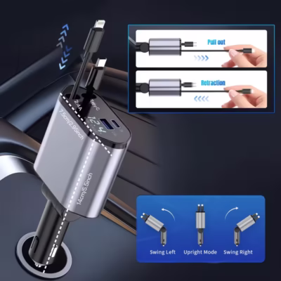 Upgrade your car charging experience with the SAN COMO 4-in-1 Retractable Fast Car Charger, designed for maximum convenience, ultra-fast charging, and universal compatibility. With 66W Fast Charging, PD + QC3.0, and a smooth retractable adjustable cable, this charger keeps your devices powered safely during every drive.
